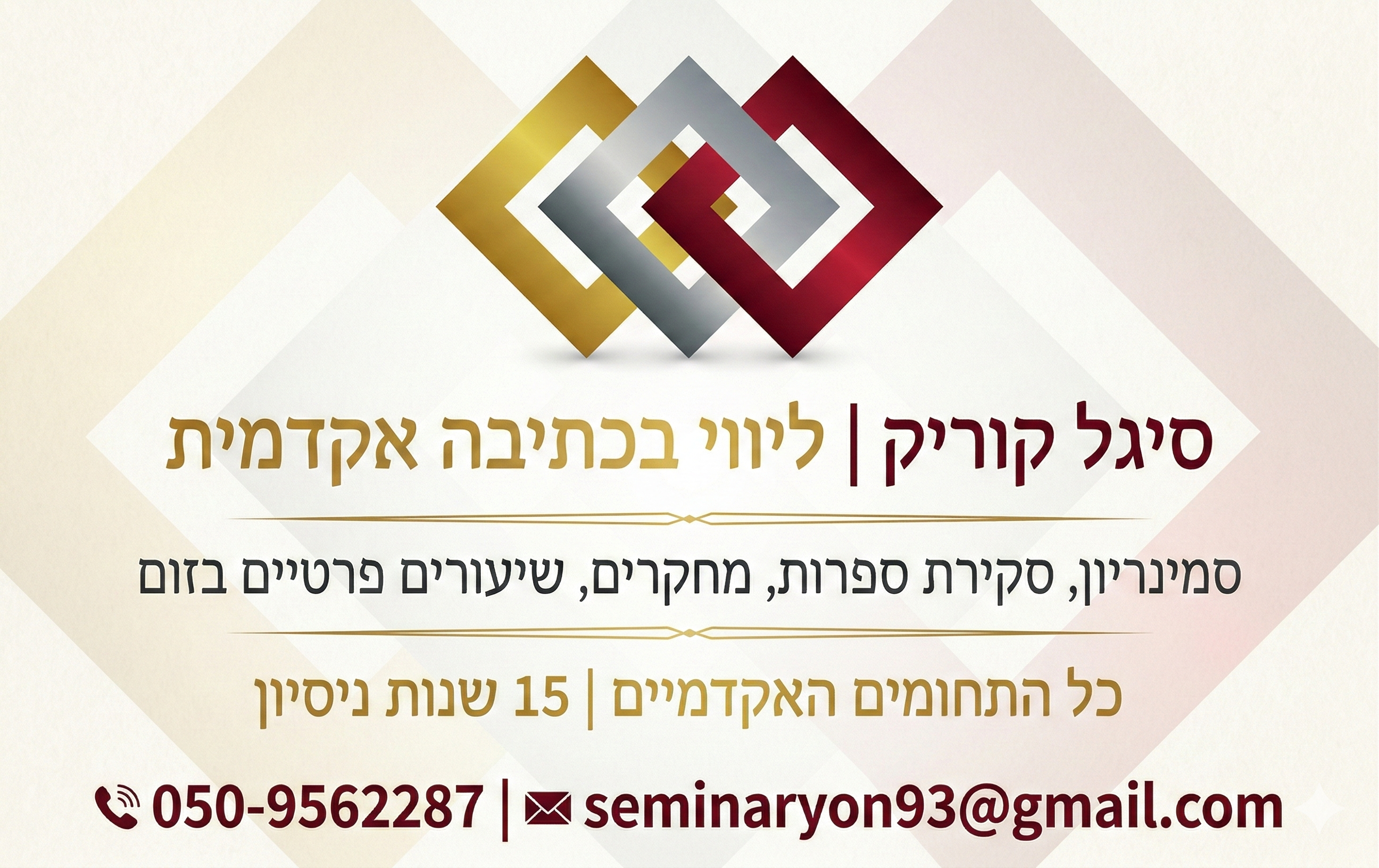 אם אתם צריכים ייעוץ לכתיבת סמינריון, עבודת גמר, או כל עבודה אקדמית, אני כאן לעזור: 050-9562287